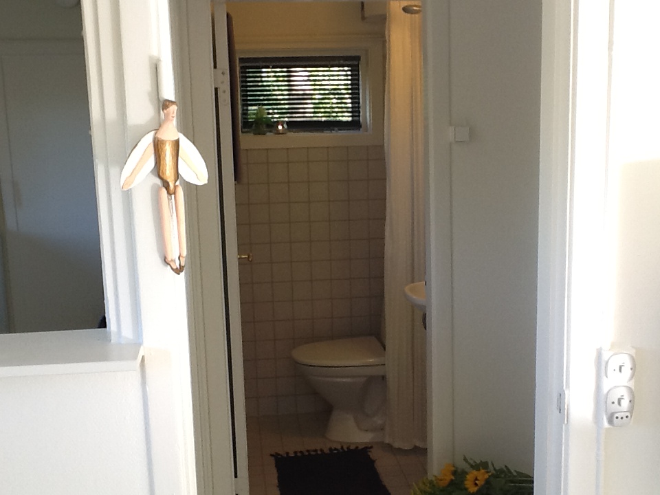 • Badeværelse med vask, toilet og bruseniche, håndklæder, toiletpapir og håndsæbe.